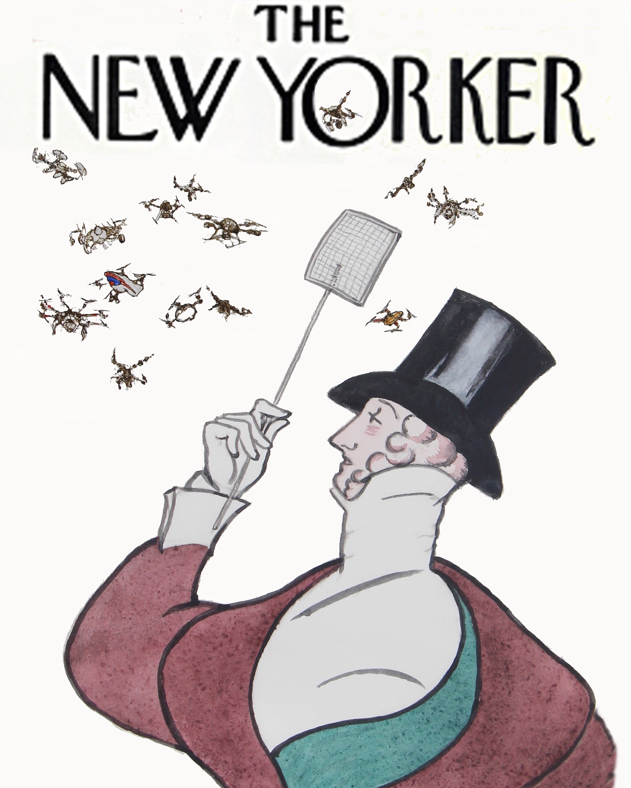 My faux New Yorker cover created in Anita Kunz smArt school class last summer..the assignment was to do a New Yorker cover..and drones had just started to appear on the scene…obviously just the drones and the fly swatter are my original idea…!!