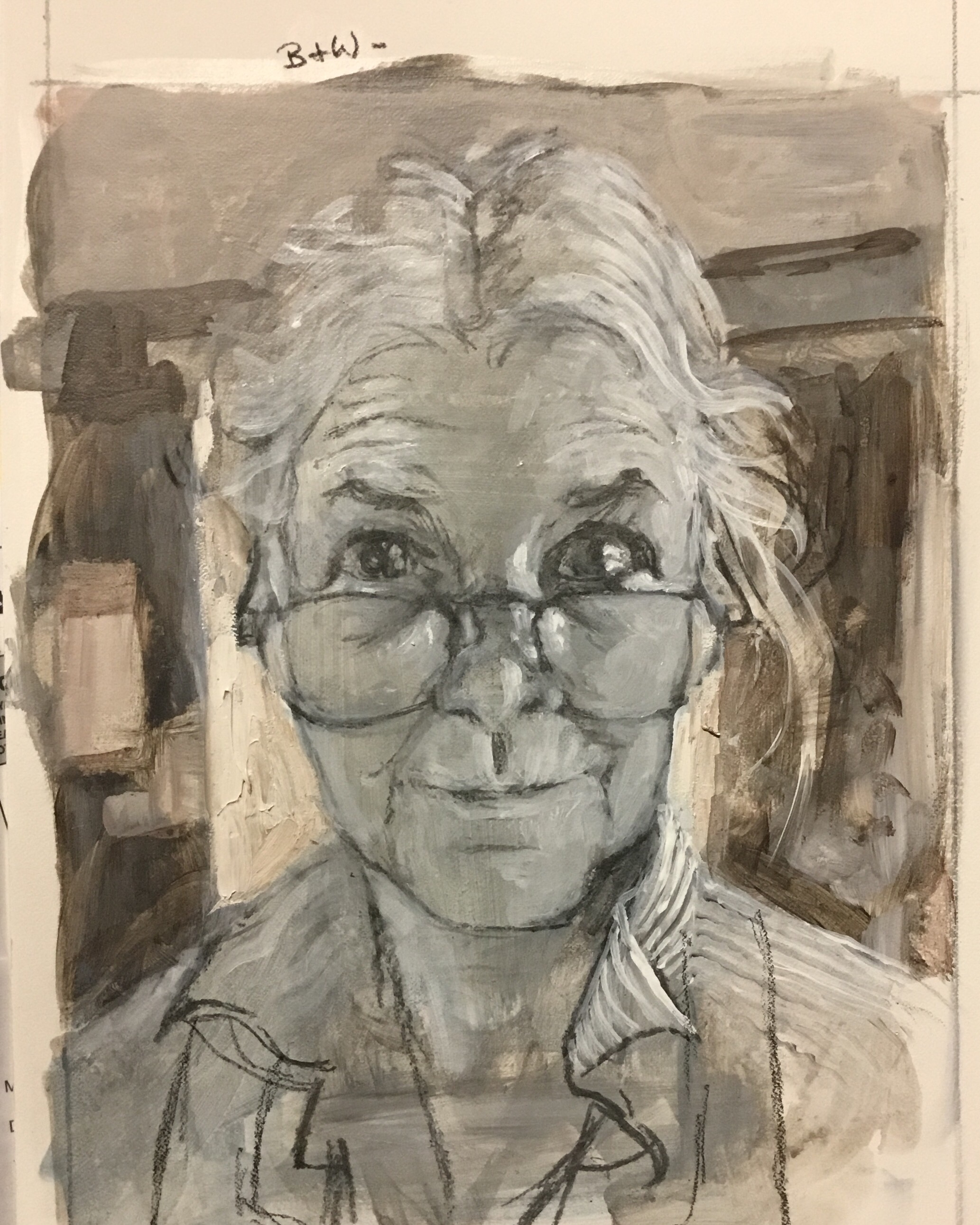 This one is black and white..vine charcoal rough drawing..sprayed with temp fix..painted with Golden’s Open (slow-drying) tube heavy flow acrylic…done from photo i took while posing for previous one…