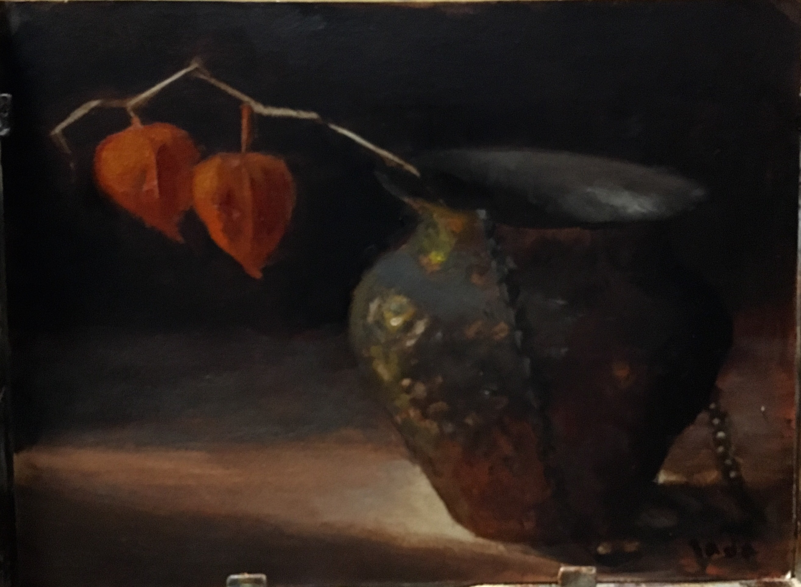 30 in 30 #20 traditional still life..6×8 oil by jada…Chinese Lanterns and dirty copper pot….could use another pass tomorrow…beginning to remember after the long hiatus while the eye has been healing…